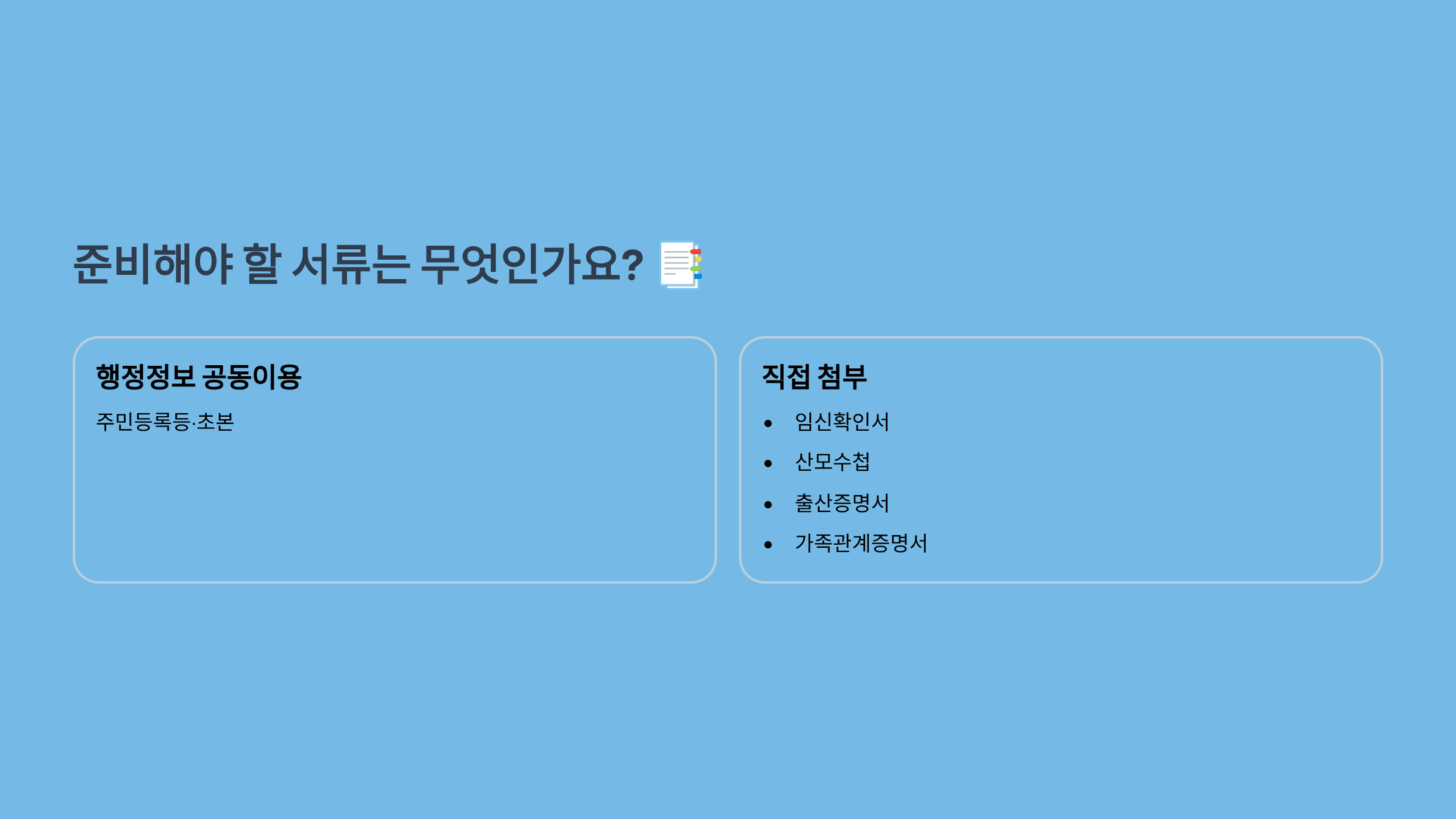 | 직접 첨부 | 임신확인서, 산모수첩, 출산증명서, 가족관계증명서 등 |